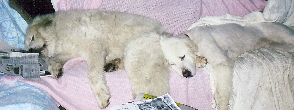 It was after dark when he called and we knew the trip to Sequim by ferry would not be feasible that night. We also require that all animals be spayed or neutered before we accept them. We asked the good Samaritan if he could find a veterinarian who could neuter the pup before we took him and if he could at least keep him overnight. We called our good friends at Scrub-A-Pup and asked if they would be willing to be the intermediary for this transfer and also give the pup a groom and a bath. As usual, they were eager to help and met the fellow at their shop in Edmonds. They all fell in love with this baby who was do dirty and unloved yet so trusting. They did their magic with his fur, but every bone in his little body showed. A healthy Pyr should weigh about 110-120 lbs. and this guy weighed barely 70. They kept him at their shop in daycare for a few days and showered him with love and attention.