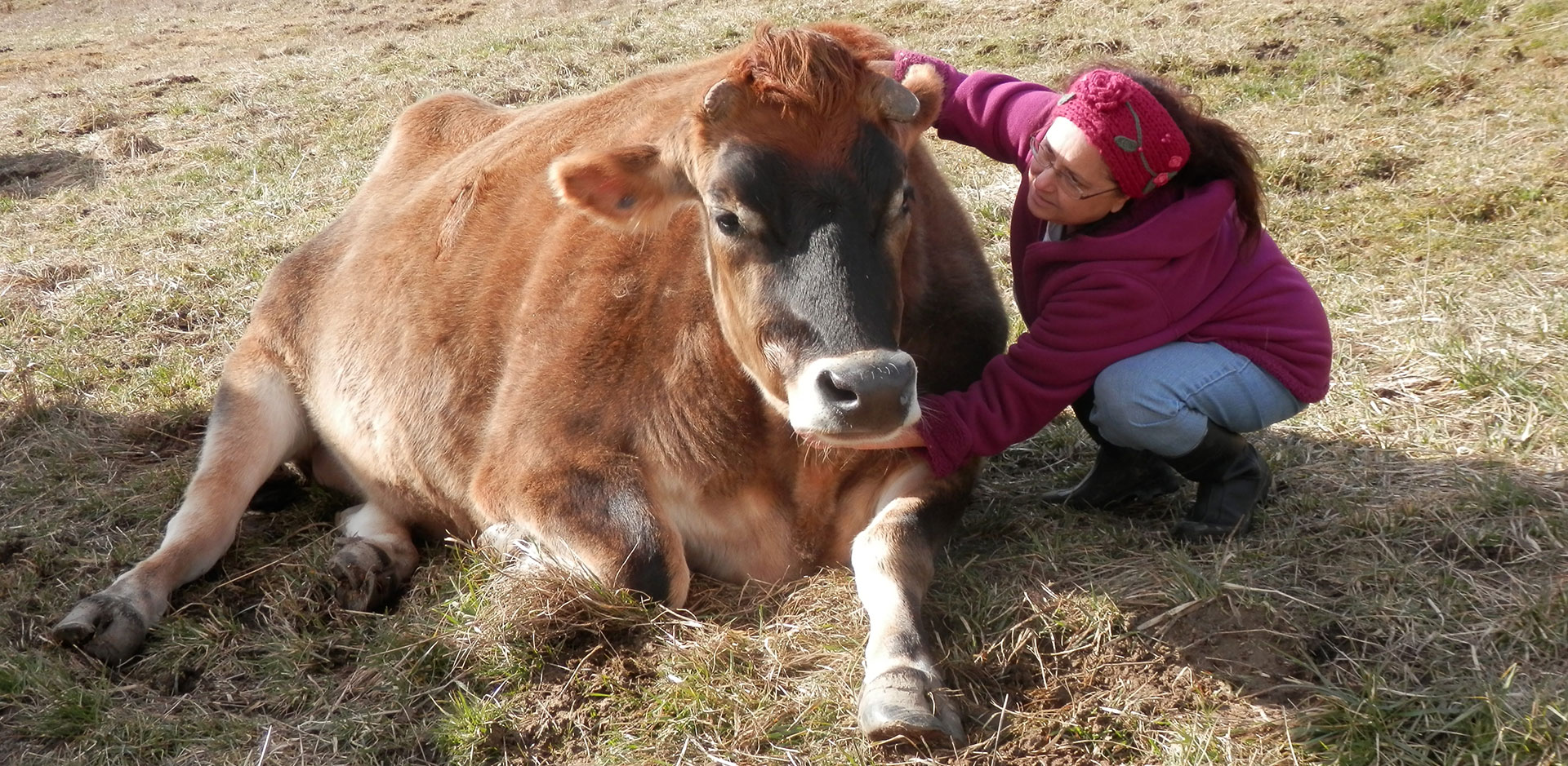 We could not take all three calves but picked Dodge, who was lying down by himself. He as carried to our van and brought to the sanctuary to see if we could save him. He is still very sick but is absolutely beautiful. He is chocolate brown with long black eye lashes and a heart on his right front leg. It remains to be seen if he can recover from his serious illness. He as named Dodge because he dodged the bullet.