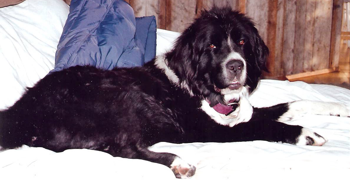 After adopting Tux, we went on a quest to find his mother. We were about to give up and headed down a dead-end road that had what appeared to be a rundown junk yard on it. We were heartbroken to see this puppy mill female Newfoundland living in a small dirt enclosure with patches of fur hanging off her sides and being totally exploited to produce numerous litters. It was a place of horror as the owner would kill sheep, goats and chickens in front of the flock and butcher them on a meat block inside their enclosure. We asked if the owner would consider letting us have the dog. He said he needed money and wanted one more litter as her prior litter of twelve puppies had all died during the winter. After much haggling, the owner agreed to sell the dog and, with help from one of our donors, we purchased her. Unfortunately, it was necessary to buy the dog, but it did result in putting this breeder out of business.