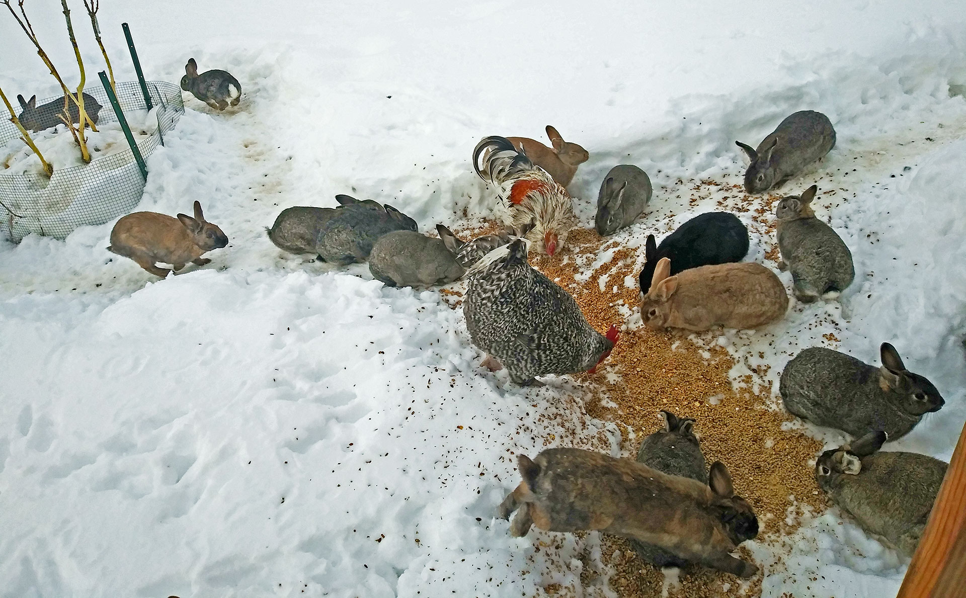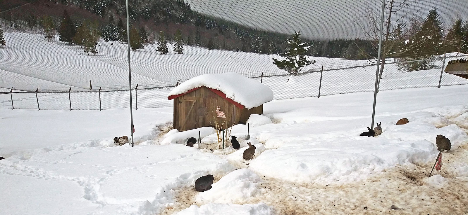 During off and on snowfall, we were slowly able to feed the cows and burros after they had gone without food for 2 days. Each day, the shoveling continued which was a very slow process. The turkeys had to wait for 5 days, the pigs 2 days, sheep 2 days and the rabbit enclosure was the farthest away and finally reached after 6 days. We were heartbroken and believed we would find many dead rabbits and roosters as they had no access to water or feed under 3 feet of snow. We were shocked to find, after this length of time shoveling and making paths, that they were all still alive as well as the two roosters that live in their enclosure.